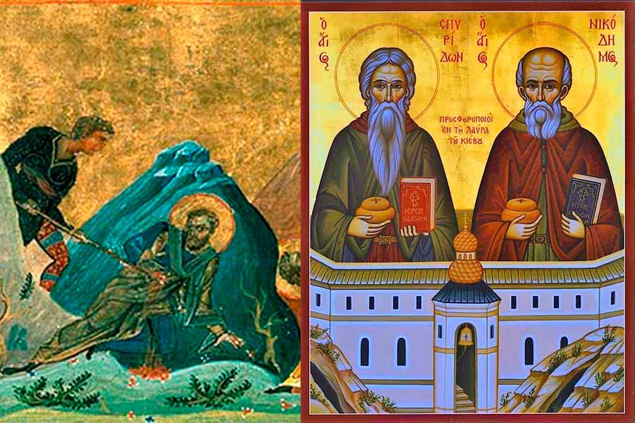 Преподобные Спиридон и Никодим, просфорники Печерcкие (ХП), 30 лет исполняли свое послушание — пекли просфоры. Преподобный Спиридон пришел в монастырь при игумене Пимене (1132-1141) уже немолодым человеком. Подвижник сопровождал свой труд непрестанной молитвой и пением псалмов. Еще при жизни преподобный Спиридон был прославляем от Бога чудесами. Известен случай, когда он потушил мантией загоревшуюся пекарню: огонь погас, а мантия осталась целой. Святой Никодим трудился вместе с преподобным Спиридоном и вел такую же строгую жизнь. Мощи их находятся в Антониевой пещере. У преподобного Спиридона пальцы правой руки сложены троеперстно. Память также 28 сентября и во 2-ю Неделю Великого поста.