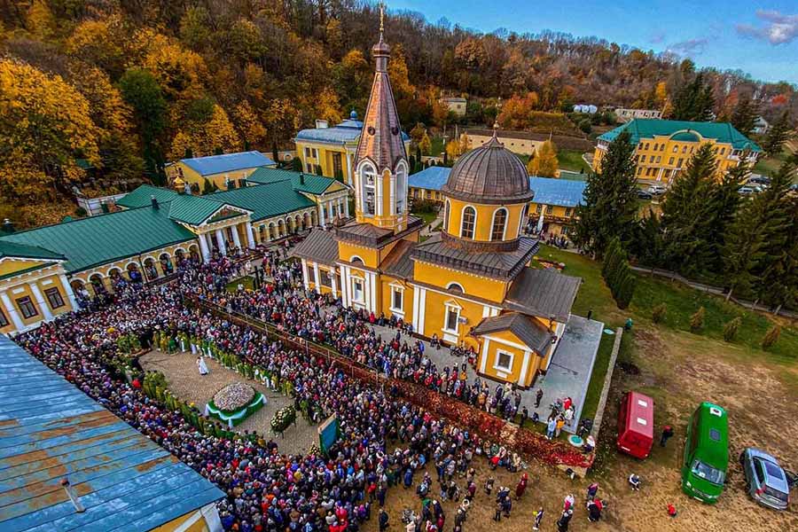 – Unde să depunem această jertfă?, întreabă un grup de femei care a sosit cu puțin timp în urmă din capitală. Afară abia de se zărește. O călugăriță ce trece pe alături le indică o ușă intredeschisă din curtea mănästirii. Femeile intră pe acea ușa și depun sacoșele cu făină, zahăr, porumb, sticle de ulei pe o masă rezervată pentru prinoase. Este ora 6.00 și enoriașele se grăbesc apoi spre subsolul marii catedrale ce se găsește puțin mai în vale, care fascinează toate privirile, ridicată în cinstea Sfinților mai marilor Apostoli Petru și Pavel.