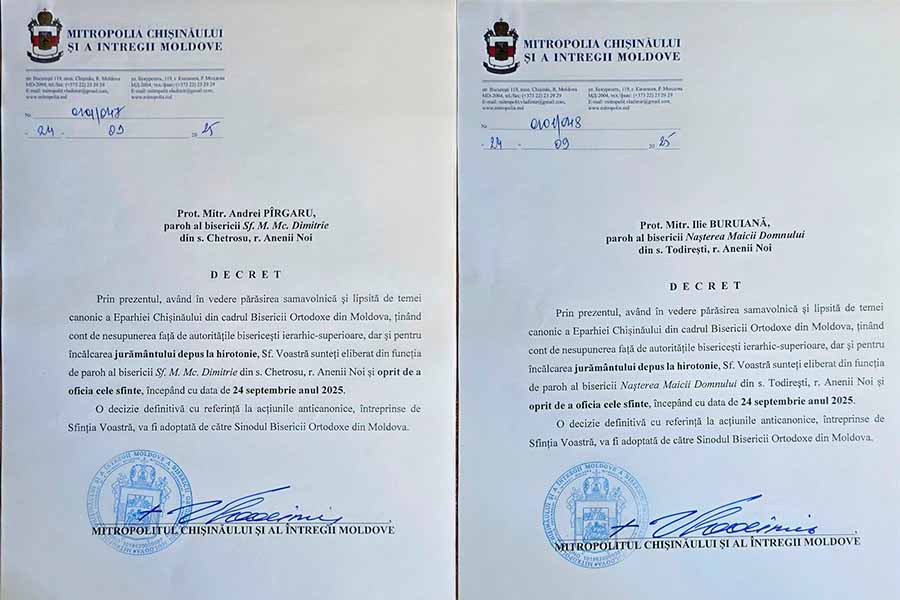 В связи с самовольным и лишенным канонических оснований выходом из состава Кишиневской епархии Православной Церкви Молдовы, а также за неповиновение вышестоящему церковному руководству и нарушение присяги, данной при рукоположении, протоиерею Андрею Пыргару, настоятелю храма Святого великомученика Димитрия села Кетросу района Анений Ной, и протоиерею Илие Буруянэ, настоятелю храма Рождества Пресвятой Богородицы села Тодирешть того же района, запрещено совершать богослужения, начиная с 24 сентября 2025 года.